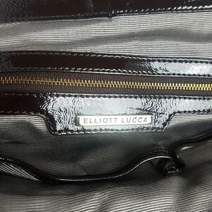 This brown, patent leather Elliot Lucca bag with chain straps is elegant and beautiful! The magnetic closure and wide opening make it easy to use! The bag is stitched, giving it a quilted feel. Overall, the bag was very gently used and is in great condition!