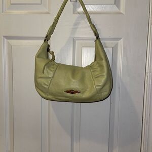 Elliott Lucca Leather mint green shoulder bag with antique tone hardwares braided shoulder strap top zipper the inside lining has a side zipper two side pockets..pre owned in good used condition clean a small mark not noticeable in the front see all pictures any questions please message.M7