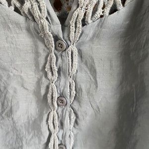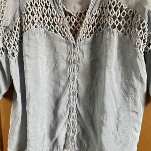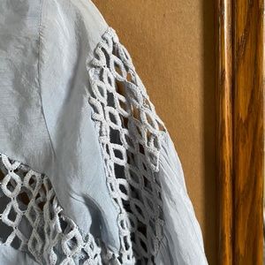 This is a blue size large Ellison Top. 70% cotton and 30% Tercel. Very cute with cutouts on sleeves and all around the top. This shirt buttons up. The material feels a litte silky. There are no tags but I've never worn it. The cut outs around the sleeves was a little itchy to me. The color is closer to the close ups in the photos.