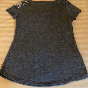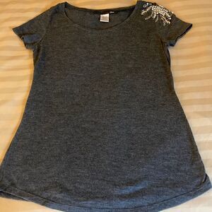 Ellison cap sleeve gray women’s top with sequin embellished shoulder. Embellishment is rhinestone & iridescent beads. Features Round neck, cap sleeve & round hemline.