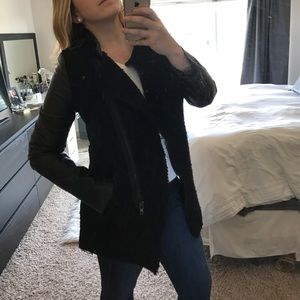 Soft jacket with faux leather sleeves. Diagonal zipper. Slightly distressed. Super cute for a date night paired with jeans.