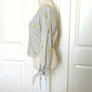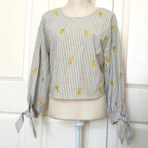 Ellison Pineapple Open Back top. Pineapples are gold thread embroidery. Bow/ tie back style. Tie at the wrist. White & Gray stripes. Fun and flirty for summer to fall transition