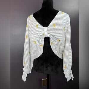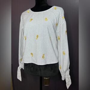 Lightweight cotton-linen blend with gold embroidered pineapples, tie-cuff long sleeves, and a surprise open-back bow detail. Striped in gray and white. Approx. 22” long, 23” pit to pit.