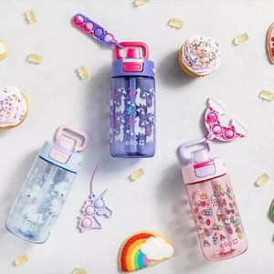The Ello Colby Pop 14-ounce plastic tritan kids water bottle is lunch bag and backpack friendly. Colby's leak-proof locking flip lid features a fully-covered soft silicone straw that stays clean and minimizes spills. Colby is easy to take with you while on-the-go with a built-in soft touch carry loop. Designed specifically for kids, this bottle is perfect for small hands and staying hydrated throughout the day. A removable silicone fidget toy is included on this bottle which is a top trend in kid’s items. The silicone toy is entertaining and soft to the touch, and will keep little hands busy for hours. Kids love the appeal of the fidget and it can also clip onto any water bottle of their choice so it won’t get lost or fall off. These bottles come in an array of fun colors and patterns including blue, pink, purple and green! This bottle is BPA/BPS free and all parts are top rack dishwasher safe. You can remove the silicone straw to make cleaning a breeze. The lid was also designed to be super easy to remove for filling, adding ice and cleaning! This set contains three 14-oz plastic Tritan water bottles with three fidget toys.