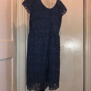 Navy blue lace overlay dress. Scoop neckline and back scooped also with zipper down the back. It has cap sleeves and is about 37” from shoulder to scalloped hem. It’s more like midnight blue. Light weight summer dress. Gathered pleats at waist line. Worn one time