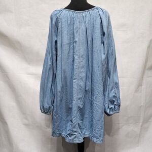 Long elastic cuff sleeve, lightweight Denim, short dress or Tunic. V-neck with a tassle cord tie for neck. Size 1X
