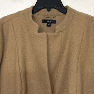 A classic wool-blend camel coat by ellos, size 20. Beautiful swing/A-line silhouette with clean minimalist lines and a collarless neckline. Features a soft quilted satin lining, flap pockets, and button front closure. Spare matching button included. Warm without being bulky — perfect for fall and winter layering