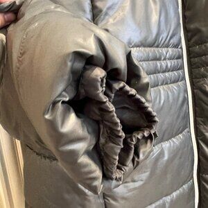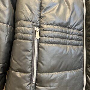 Medium gray zipper front puffer jacket with two pockets. Great for cold days! Elastic in the back (to help contour) and at the wrists (for warmth.) Measures 29 inches pit to pit and 33 inches in length. No hood but lots of great details.