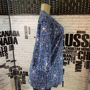 ITEM: Ellos10 Blue Geometric Print Tie Neck 3/4 Bell Sleeve Top