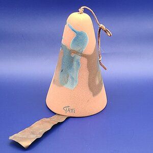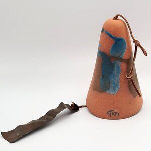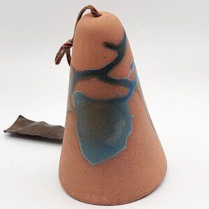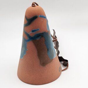 This beautiful terra cotta colored Southwestern motif ceramic wind bell by Elmer and Lorrane Gatti has a lovely abstract hand painted design in blues and browns. It includes a copper tag hanging from the clapper. The leather hanger can be knotted at whatever length you desire. Minor surface scuffs, good vintage condition.