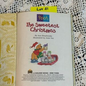 The item pictured is a "Little Golden Book" titled The Sweetest Christmas, written by Ann Braybrooks and illustrated by Josie Yee.
