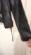 Sleek black leather jacket. Features asymmetrical zipper and belted waist. Perfect for stylish layering.