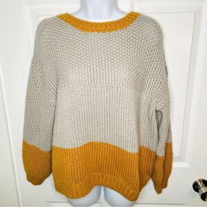 Elodie CrewNeck Colorblock Chunky Knit Sweater Balloon Sleeve Gray Mustard Yellow Size Small. Two tone sweater features light gray upper section and a warm mustard yellow lower section with long balloon sleeves. Wide rounded crew neck and relaxed oversized fit, making it a comfortable choice for casual wear. Gently used Good Preowned Condition. Slight pilling.
