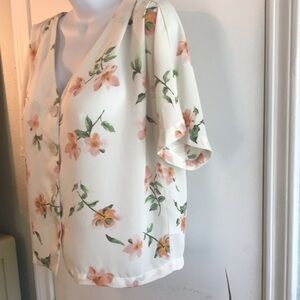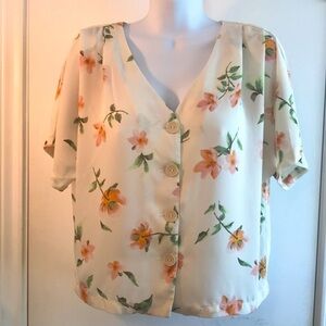 Elodie women's floral print top, button up with large vintage style buttons, V-neckline, short flutter sleeves gathered at the shoulder, fabric of 100% poly, in excellent condition. Super cute with high waisted jeans.
