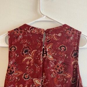 Elodie sleeveless top tank top. Mock neck swing-style. Burnt orange red and black with floral poppy paisley-like design. Back keyhole button closure.