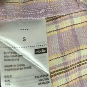 Chic lavender plaid blouse with button-up front. Sleeveless design for versatile styling.