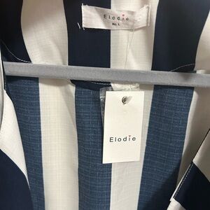 Elevate your wardrobe with this stylish navy and white stripe blazer from Elodie. Designed with an open front and roll tab sleeves, this blazer is perfect for any occasion. The lightweight fabric makes it comfortable to wear all day long.