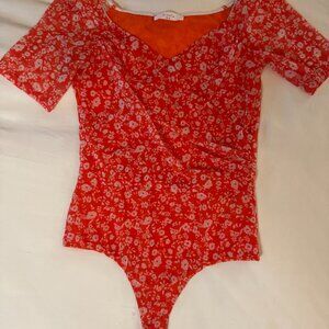 Elodie Orange Floral Mesh Wrap Bodysuit (M) – Stretchy Form-Fitting