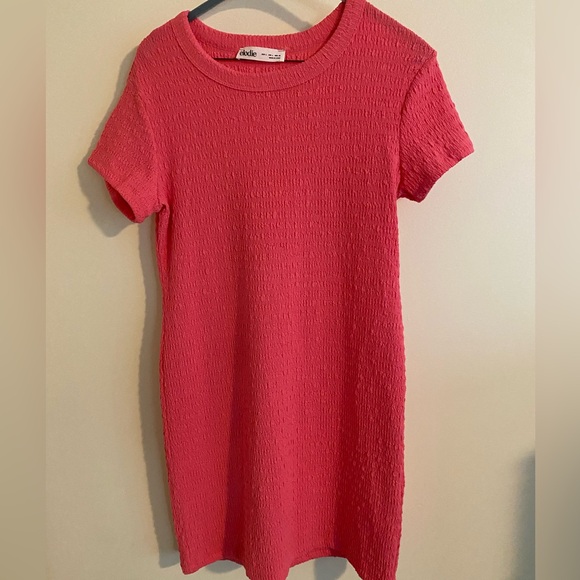 salmon pink / barbie pink textured short sleeve mini dress or wear as a tunic top. Poly spandex blend, texture is similar to ribbed or slight ruching.