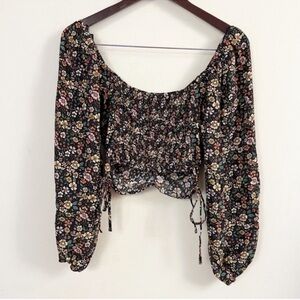 Brand new. Round neck. Long puff balloon sleeves. Multi color floral print allover. Lightweight. Cropped. Ruched tie side detail. Smocked back. Pullover blouse.