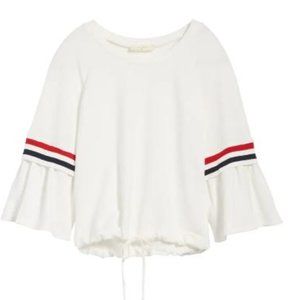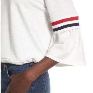 Old-school athletic style with on-trend appeal—this retro varsity-stripe sweatshirt is playfully updated with flared bell sleeves.