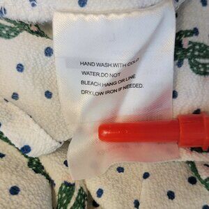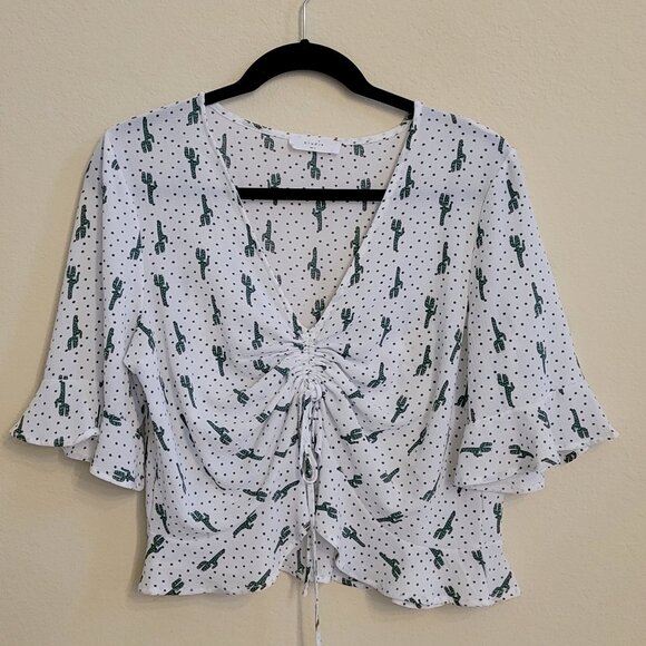This top is adorable and perfect for summer! A little bit boho, a little bit coastal cowgirl. This very gently worn fun and whimsical lightweight short-sleeved white blouse combines classic blue polka dots with a cowgirl green cactus print. The top has a v-neck with and adjustable scrunch tie-front and subtle sleeve and hem ruffles. .