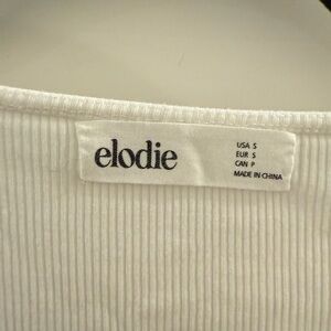 Keywords: Elodie, women's top, white blouse, long sleeve, square neck, soft, stretchy, elegant, fitted, ruched sleeves, casual, formal, rayon, spandex.