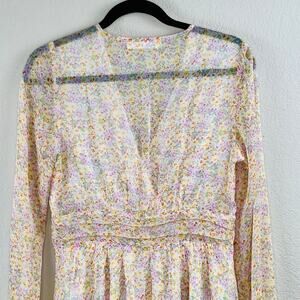 Elodie White Multi Floral Sheer Ruched Front Tie Surplice Mini Dress Medium NWOT