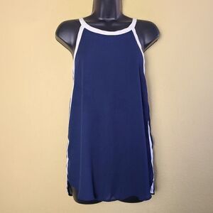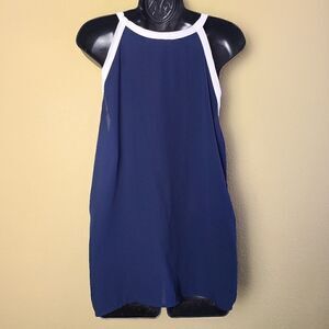 This is a tank top by Elodie. It is navy blue with white trim and straps. Note both arm openings have loose threads/extra stitches as shown in the photos.