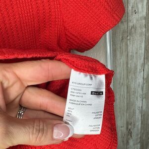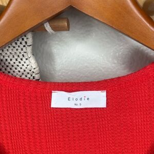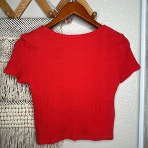 This vibrant red crop top from Elodie features a stylish button-down front (faux, not functional) and short sleeves, offering a chic and modern look. The fitted silhouette and waist-length design make it a perfect choice for casual outings. Size small. Preowned, but like new. No flaws or fading. Very stretchy.