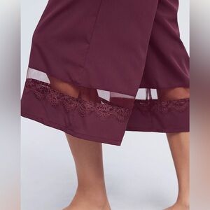 Soft Silky Satin Bordeaux / Wine Color, 2 Piece Loungewear / Pajama / Sleep Set, E by Eloise For Anthropologie. Camisole Top Features a Lacey T-Back, Non-Adjustable Spaghetti Straps & a Sweetheart Neckline in Front. Cropped Wide Leg Palazzo Pants Feature Elasticized Waistband In the Back, Flat Front Waistband, Front Hip Pockets, Laced Detail at Bottom & Sheer Panels Above the Lace. Can Be Worn As Pajamas or Styled & Worn Out. 100% Polyester.