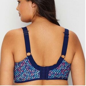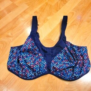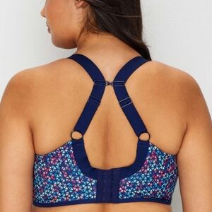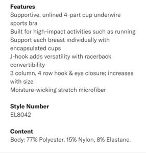 This is an amazing style sports bra. Made for high impact workouts ornworkouts of all types. Encapsulates each breast for secure fit to prevent movement and back pain. Beautiful pattern, adjustable band and straps. Underwire. Excellent condition.