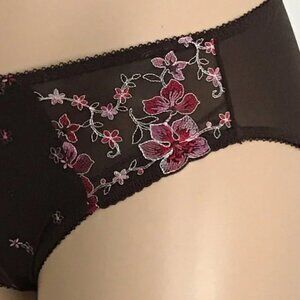 The Elomi Tamarie Brief Panty brings feminine elegance to everyday comfort. Featuring mocha tulle with shades of pink corded embroidery, this mid-rise brief offers full front coverage with a semi-sheer back for a beautifully balanced silhouette.