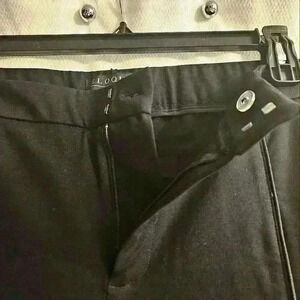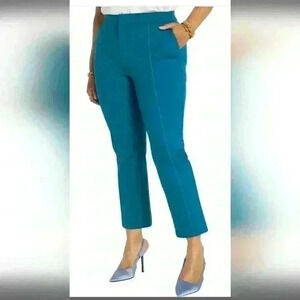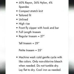 Made out of scuba-like fabric, slim leg and stretchy but keep their shape. A single pinstripe down the front of the legs. Ankle length (see photos for measurements). Very comfortable-I have them in a different size in 3 colors and wear them all the time. NWT.