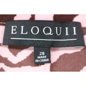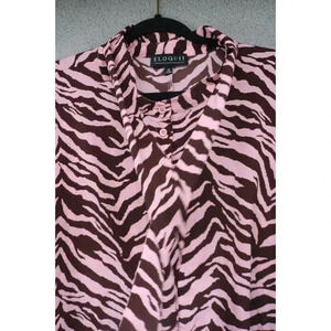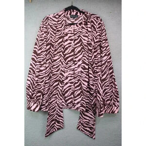 This is an Eloquii Pink and Brown Animal Print Button Down Blouse that is a size 28. It has a tie in the front below the neck. It is 100% Polyester. Laying flat, it measures: Armpit to armpit-31.5" and the length is 29.5". It is in great condition.