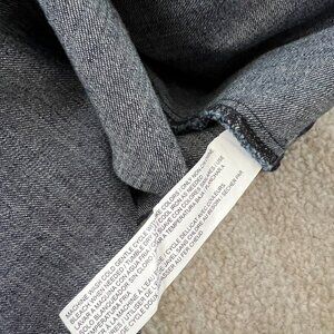 A blue sleeveless faux wrap surplice dress with pockets and belt. Not lined. Waistband has stretch. Hem likely falls below knees depending on height.