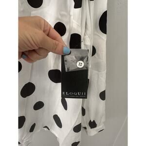 Missing the button, but does come with the extra button. The Eloquii Bow Front Polka Dot Blouse in size 18 is a feminine and retro-inspired top perfect for a career-oriented woman. Made from chiffon fabric in a cream color with a classic fit, this blouse features a charming bow accent and short sleeves. The polka dot pattern adds a touch of whimsy, making it suitable for a 50s or 60s-inspired look. Designed by ELOQUII, this blouse is a stylish choice for women looking to make a statement in their wardrobe.