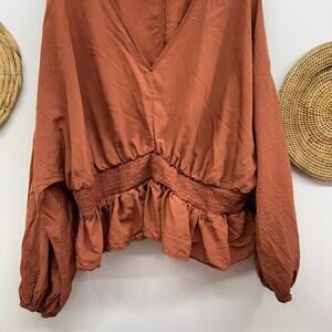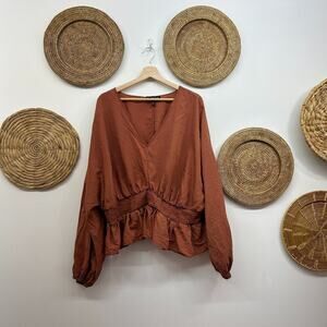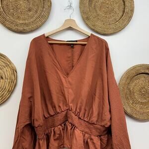 Eloquii Brown Neutral Smocked Waist Peplum Long Sleeve Blouse Top Plus Size 26