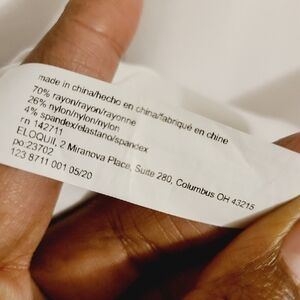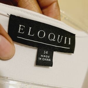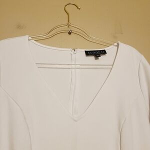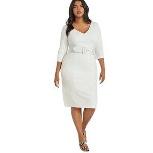 Women's white tailored fit work dress with waist seam by Eloquii, size 14. Elbow length sleeves with small split at ends; hidden back zipper. Dress hits below knee and has a back vent slit. Excellent pre-owned condition overall; BELT IN STOCK PIC IS MISSING. Can add own or wear without a belt.