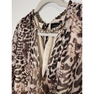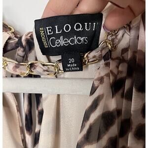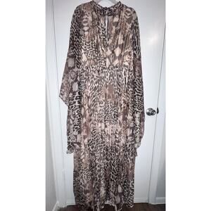 Eloquii Collectors leopard print chiffon maxi dress with lining underneath. Waistband stretches to about 52” in total. Pit to pit is about 26”. Has a deep V plunge in front and back. A gold tone chain lines the collar of the dress and the sleeves are dramatic bell sleeves. A great wedding guest dress! Please check all measurements.