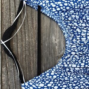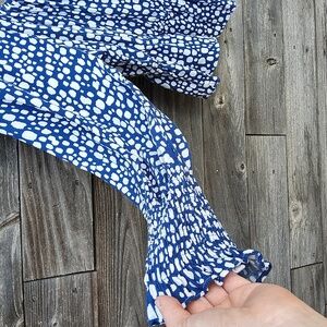 Eloquent Elements blue and white blouse, white dots pattern all over, long sleeve with elastic cuffs at the wrists, elastic at the waist, elastic around the neckline, size 18/20, plus size, approx 22 inches in length from top of shoulder to bottom of the hem