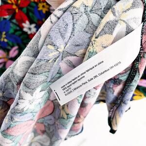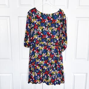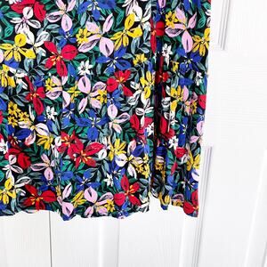 Knot front detail. Shirred flounce hem. 1/4 balloon sleeves. Tropical floral print.