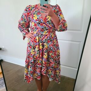 New with tags, fun and colorful faux wrap dress. Pull on style, light weight, very little give to fabric.