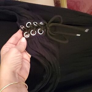 Eloquii Black Dress. Cool attached belt/sash with grommets. Sharkbite midi hem. Very soft. Great for work or date night.