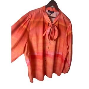 Orange and pink ombre stripes. Tie neck, or open for a v- neck. Button up blouse, long sleeves with cuffs.