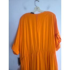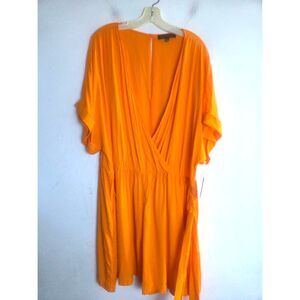 Stylish wrap jumpsuit by Eloquii. Features a vibrant orange color. Short sleeves and tie waist detail.