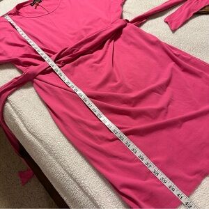 Dress is made from a thick t-shirt like material with attached wrap around belt to style in a variety of ways. A bright, vibrant, pink color. Can be dressed up or down.