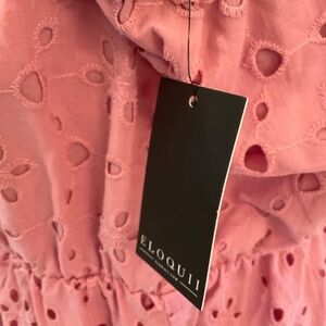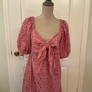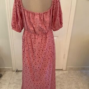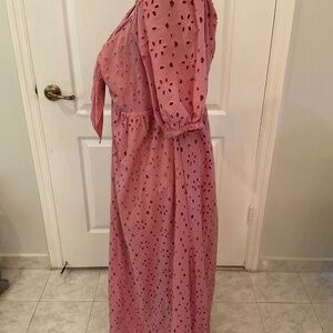 Beautiful Pink Eyelet Maxi Dress, with puffy sleeves and sweetheart neckline. The dress is fully lined with elastic back. The dress is Pullover and size 18. This dress is NWT.