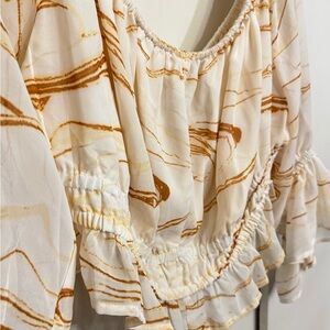 ELOQUII Plus size cream and gold/brown off the shoulder crop top. Elastic bottom, ruffle sleeves. Size 18.