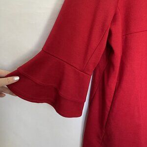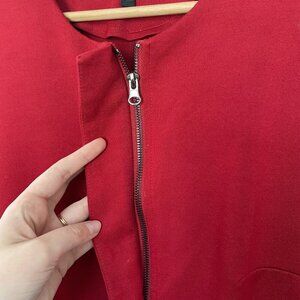 A vibrant red jacket offering a chic silhouette, featuring a zippered front and stylish ruffle sleeve detail. Made for a polished and modern look.